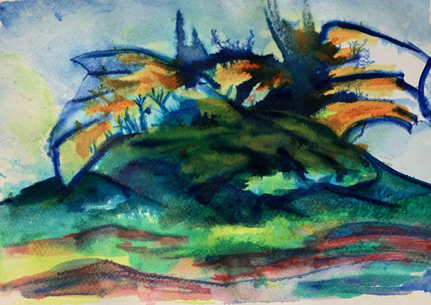 I thought of flight and began drawing the shape of dragon wings, outstretched over a landscape. Suddenly the dragon herself came roaring over the hill, its open wings both a shield and protection for the hillside town beneath.