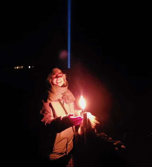 Holding the light with the Imagine Peace tower light streaming heavenwards. October 9, 2019.