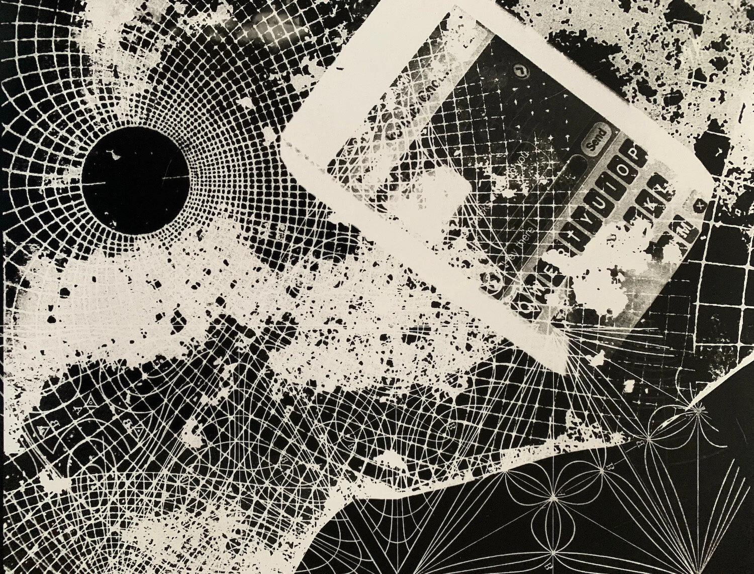 Maxwell’s Equations, photographic print 2012. A black hole time portal with a mobile phone. Maxwell was a 19th century physicist whose scientiific equations to prove eltromagnetic radition built the basis upon which our digital technology is based.