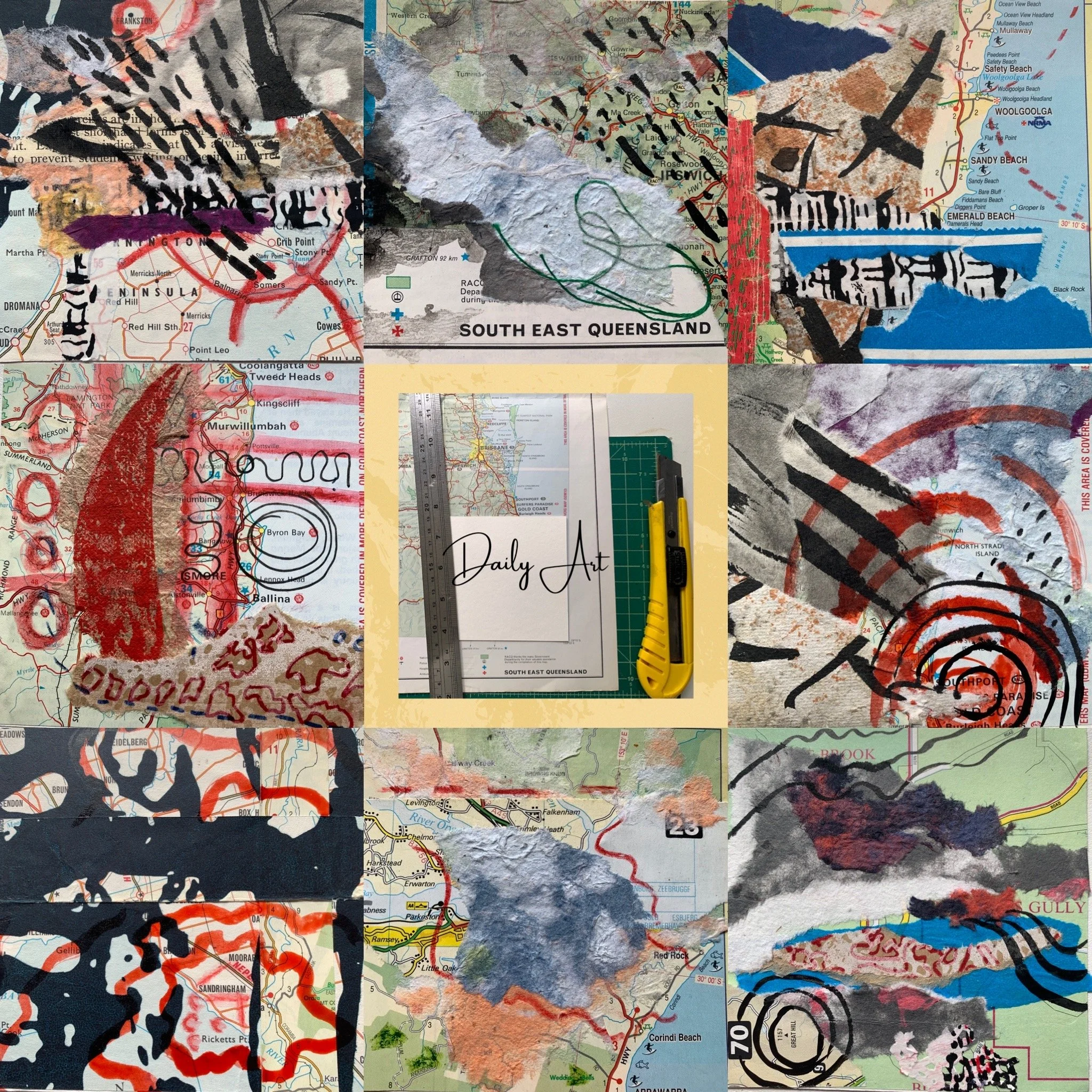 I am collaging with maps, small squares of a landscape that take me travelling through time and memories, into the future with places I would like to go or are planning to go. Forward thinking into a landscape before I arrive.