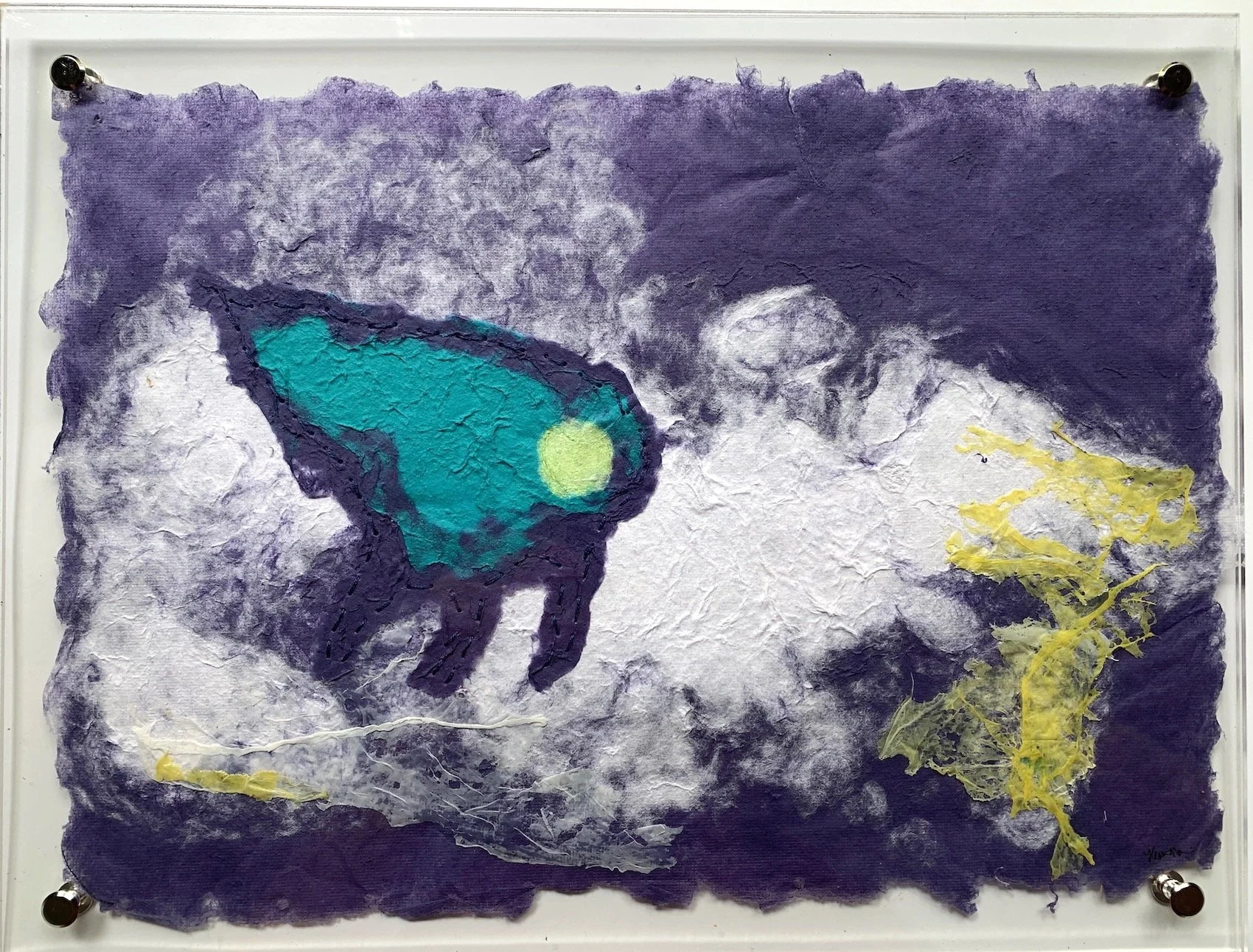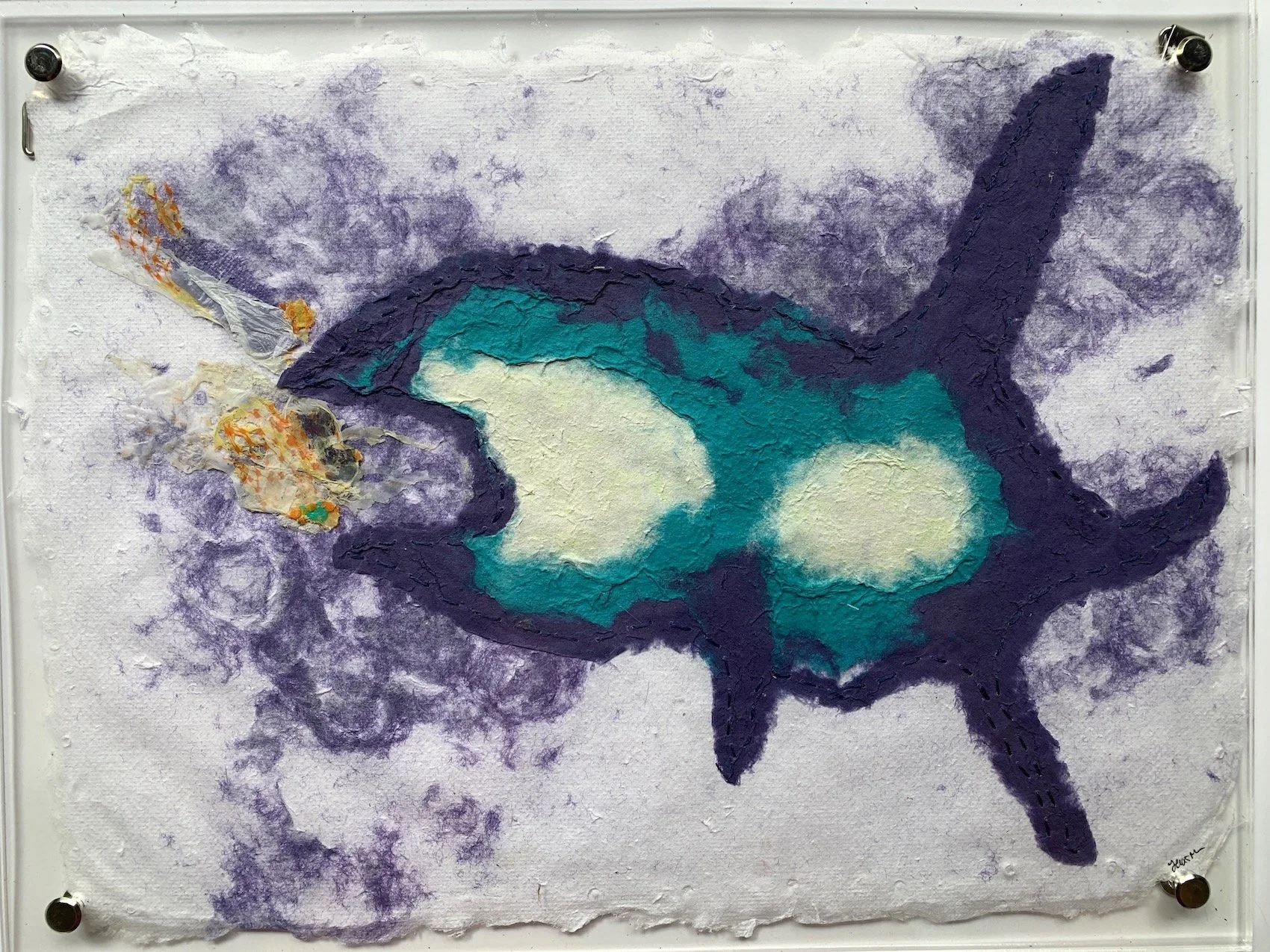 “In this series of small works, I created paper from recycled cotton pulp and added anamorphic sea creatures to a marine landscape. Fused and stitched into these waters are plastic and mesh produce bags along with my tidal collections of fishing line, plastic particles and other flotsam fragments. If this landscape filled with its floating debris wasn’t so deadly it would look beautiful in all its glittering colours.”