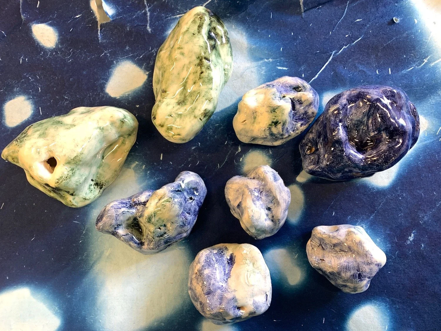 Staying with my project, I decided to keep it simple. I’ll make some ceramic stones. While others were carefully making bowls, cups and figures, I caressed the wet clay into little stone shapes, the sort I’d like to pick up off the ground and hold in my palm. During the process of the week we put oxide on our creations, had them bisque fired and then glazed them before their final firing.