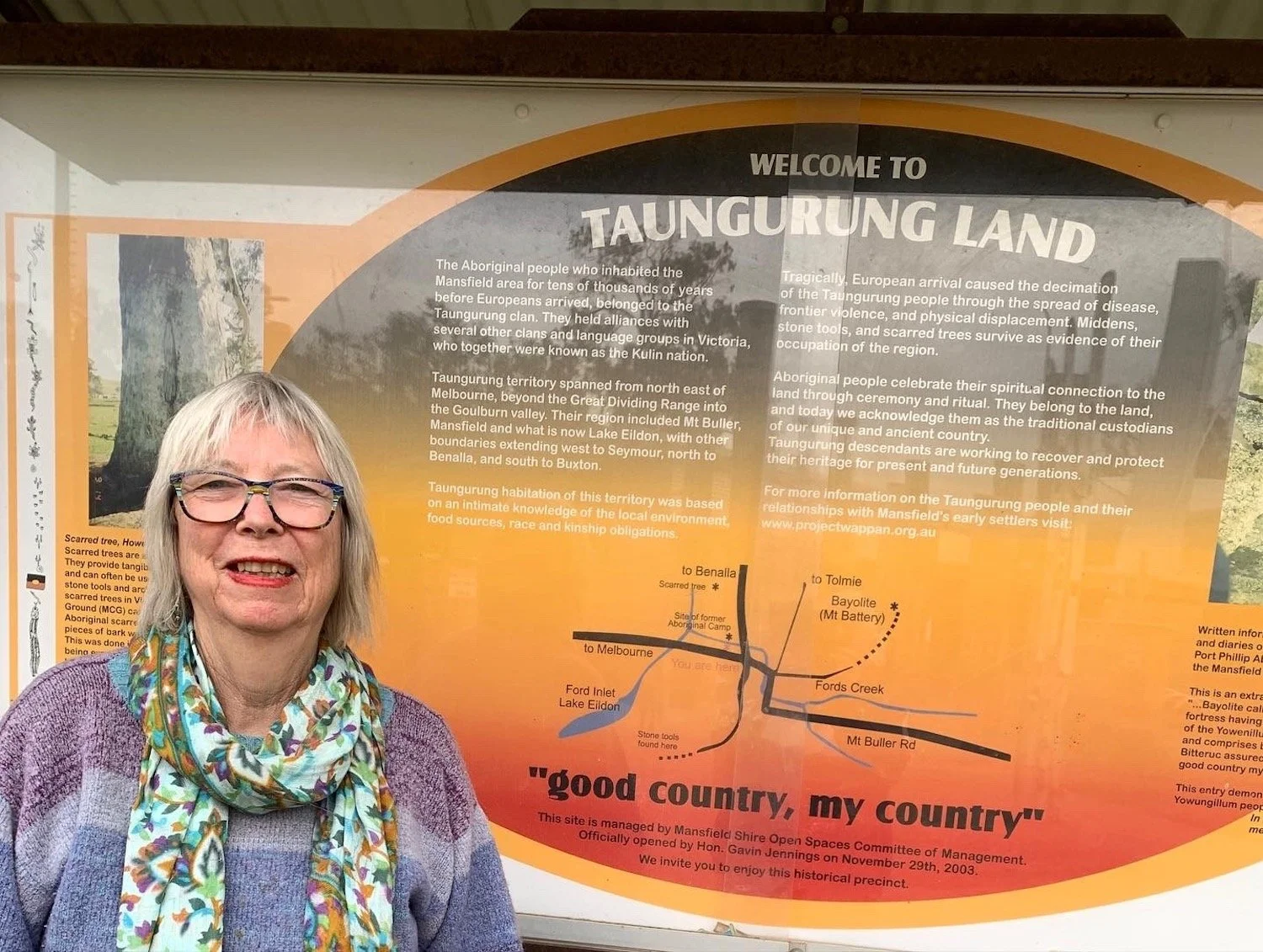 I revisited the library where I was the branch librarian for 12 years, taking it from a tiny room tacked onto the wing of the old council chambers, to the now bustling community hub it has become. I also drove out to the beginning of the town where the Taungerung sign stands next to the new information centre. This sign came out of the research I undertook to write a play The Widow of Wappan. This in turn led to Project Wappan, a community project which honoured the indigenous people of the area and included preserving a scar tree and creating a snake dreaming wall.