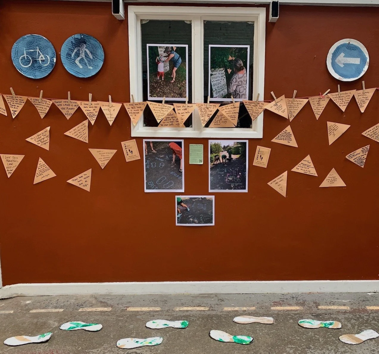 I reconstructed a version of the event for our open house ‘findings’ which showed the triangular flags we hung on the hedgerow where people wrote about what the proposed housing development on the ancient meadows would mean to them. These were exhibited along with photos of the event. See more here. The best part is that the campaign committee members will take this documentation and exhibit it in the local Iffley hall to continue their campaign actions,.
