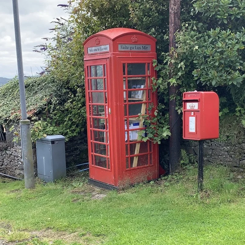 Iconic telephone repurposed with tourist maps at the Achnacroish ferry stop, Lismore.