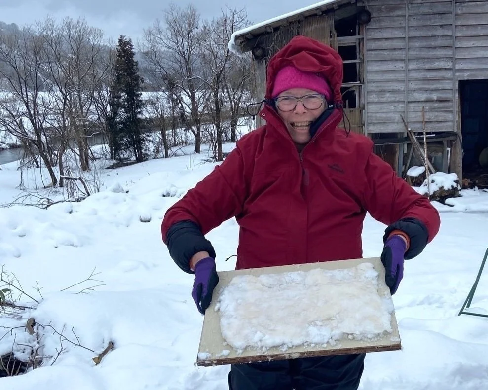 Experimenting with kozo fibre paper in the snow at a paper-making workshop