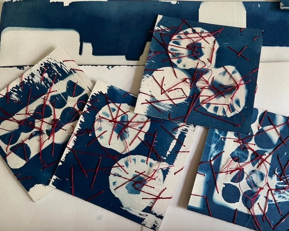 Deep blue cyanotypes hand stitched to include in the Post-Operative artist book