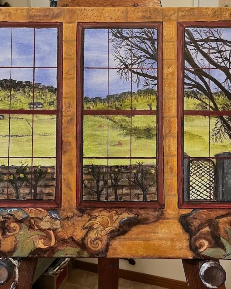 In July I returned home from Tasmania, set up my easel and tried to encapsulate both the beauty and brutality of Oatlands. I added the motifs from peeling wallpaper to reference ‘papering over’ history. The rest of the month I exercised with the physiotherapist preparing for my knee replacement surgery on July 25 th. My days in hospital were a blur of pain…