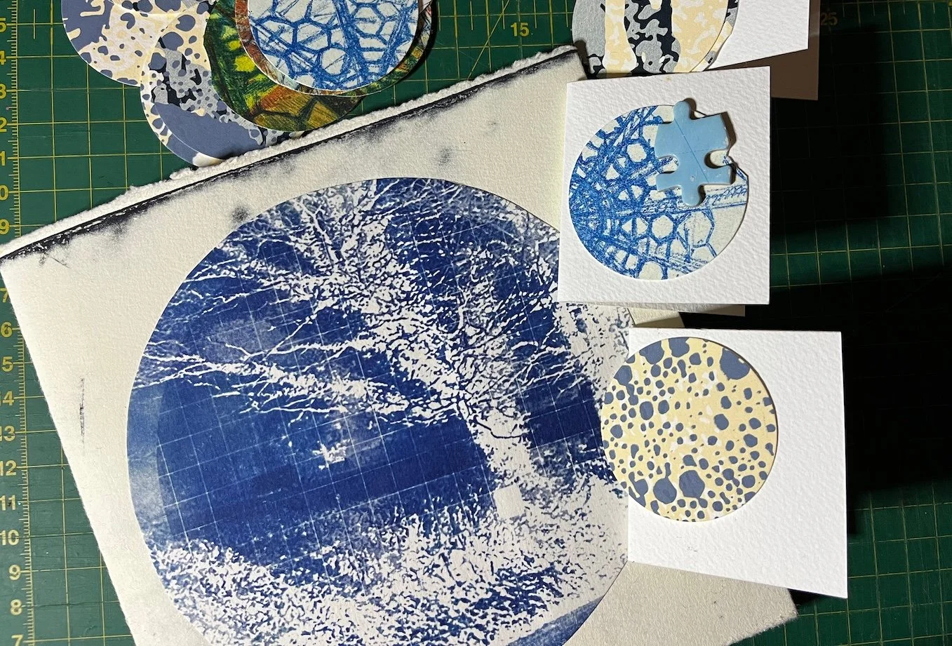 The left over jigsaw pieces fit perfectly with the new circles on the tiny cards. All from different projects long finished, yet that impulse of encircling, connecting and creating networks of small circles, remains.