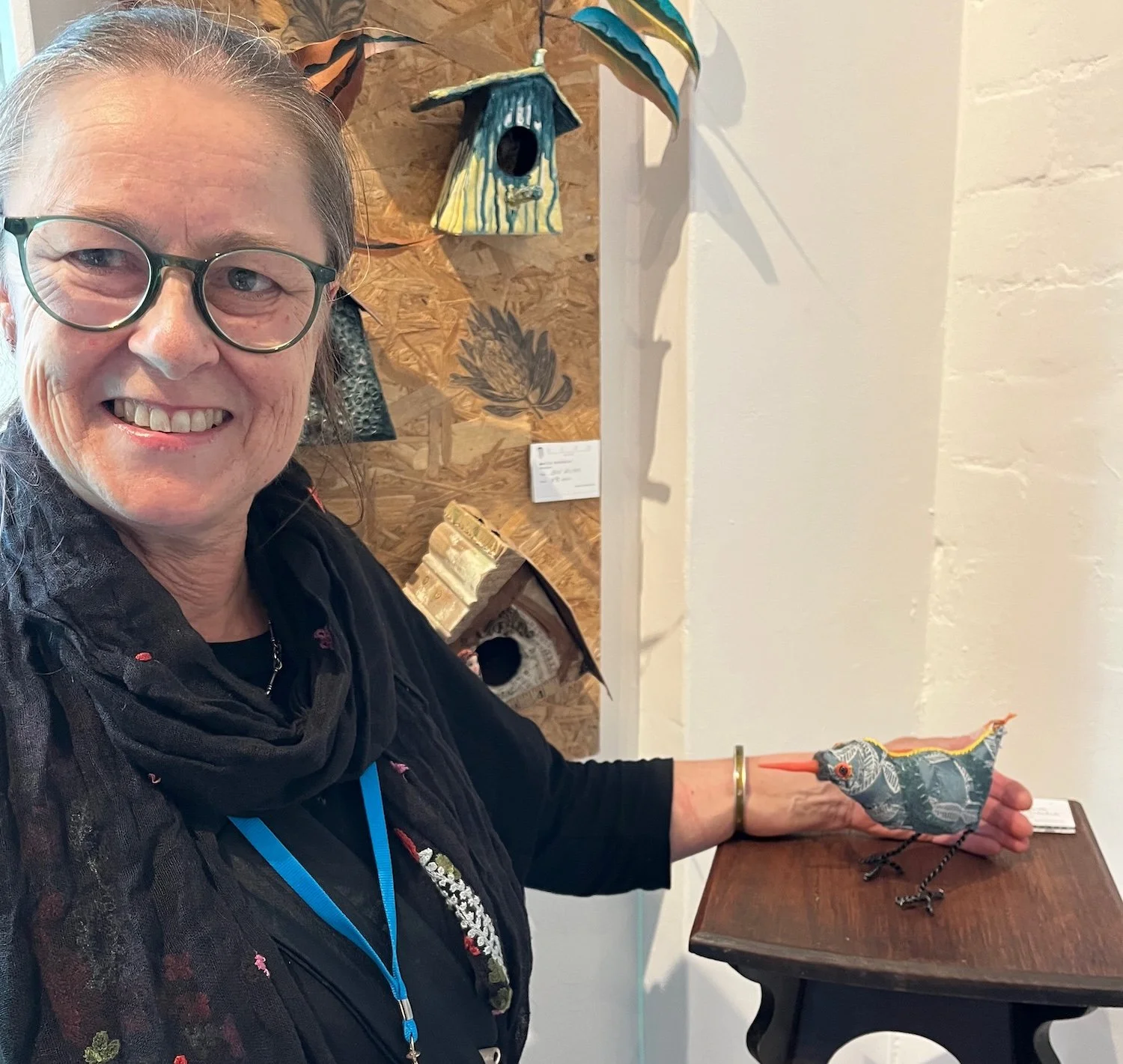 Artist Mel Bowen with her blue bird sculpture I purchased at the Murwillumbah Art Trail exhibition.
