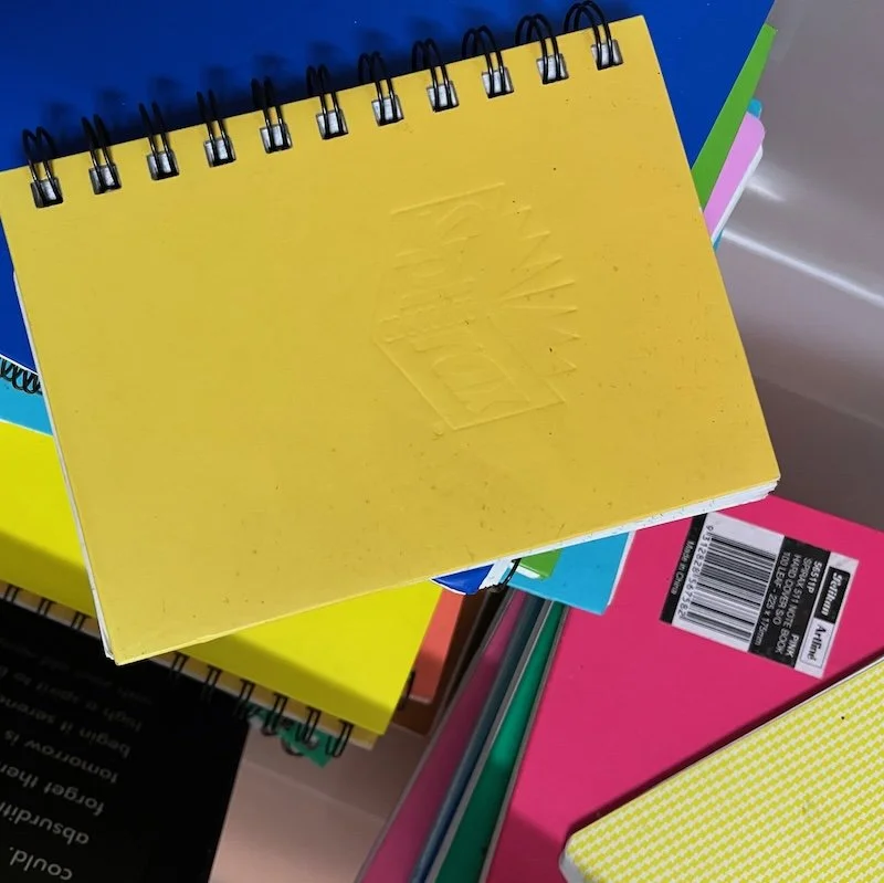I’m thinking it would be great to do an exhibition titled All of My Days. I could take off the coloured notebook covers to exhibit, or put a square ‘window’ in them to show the writing beneath. Or I could take out some of the pages and make art on them to reveal a little of the writing beneath. I really don’t know yet what shape this could take, but it has led me to think I shouldn’t throw them out right now. They might be waiting for the right time and place to have their moment of glory.