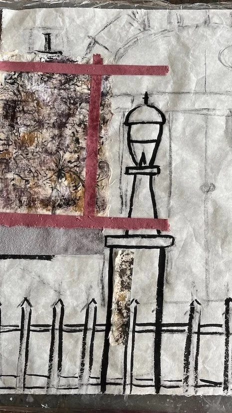 All along the high street are beautiful lamposts which wouldn’t look out of place in a London streetscape. At night they glow golden in the winter mist. I’ve wanted to capture those vertical lines and commit to them on paper.