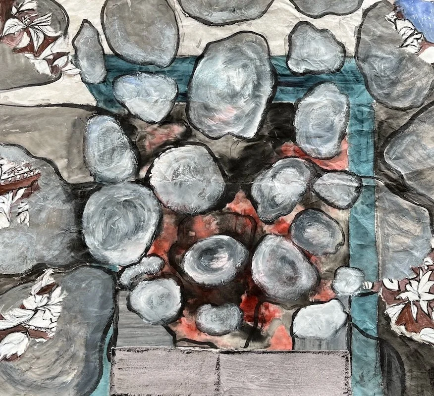 Meanwhile I used the remaining fragments of the wallpaper on my final artwork. It also was a challenge which I had trouble resolving. The main motif were the cobblestones I had made charcoal rubbings of in the old mill stables. (The mill has now been turned into a distillery). I loved the large stones all jumbling together and thought they would look good as the background to a fireplace. But I couldn’t make the composition work.