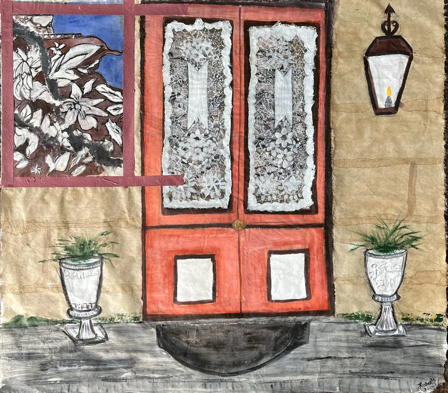 I looked at my banner composition again. I took a deep breath and tore the doors out as I had already spent an hour painting the white lace on the curtains. tI then placed them centre stage on a square sheet of kozo paper. That worked and the rest was easy.
