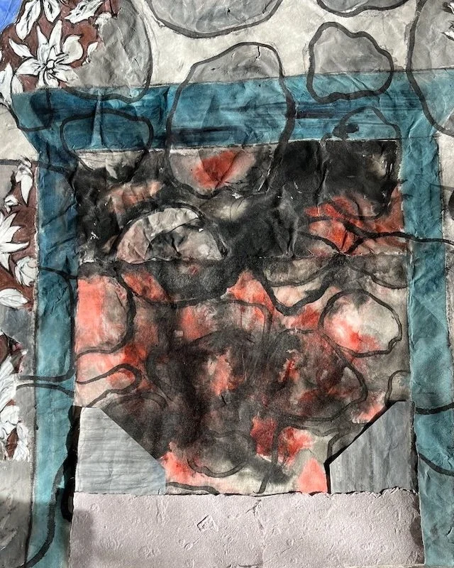 This happened several times but in the end I was happy with the results. I wanted to challenge myself with the long banner format of the kozo papers I bought in Japan. I laid out what I thought was a good composition but when i took a photo of it I knew it didn’t work. I had two distinct motifs vying for attention. They each needed their own space.