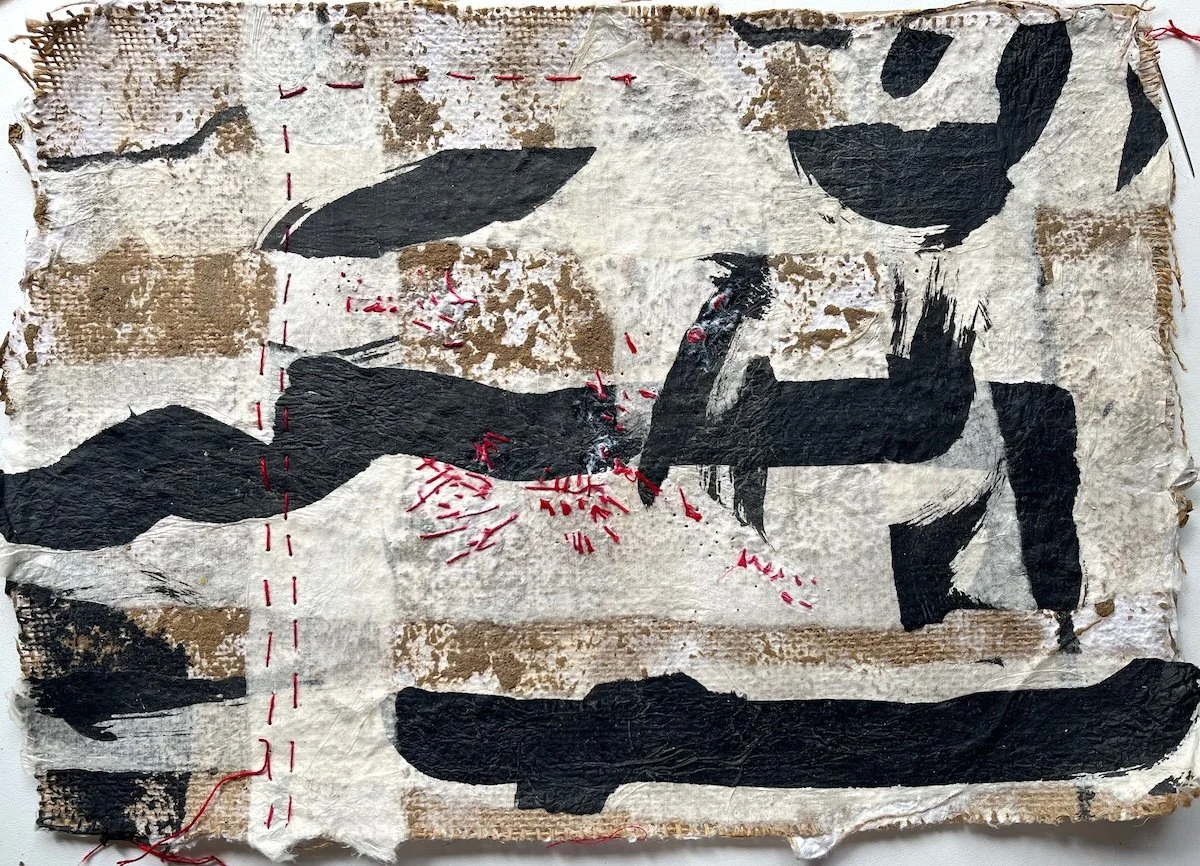 Aftermath 2025. Paperpulp, mud, ink, paper and stitching on hessian sandbag.