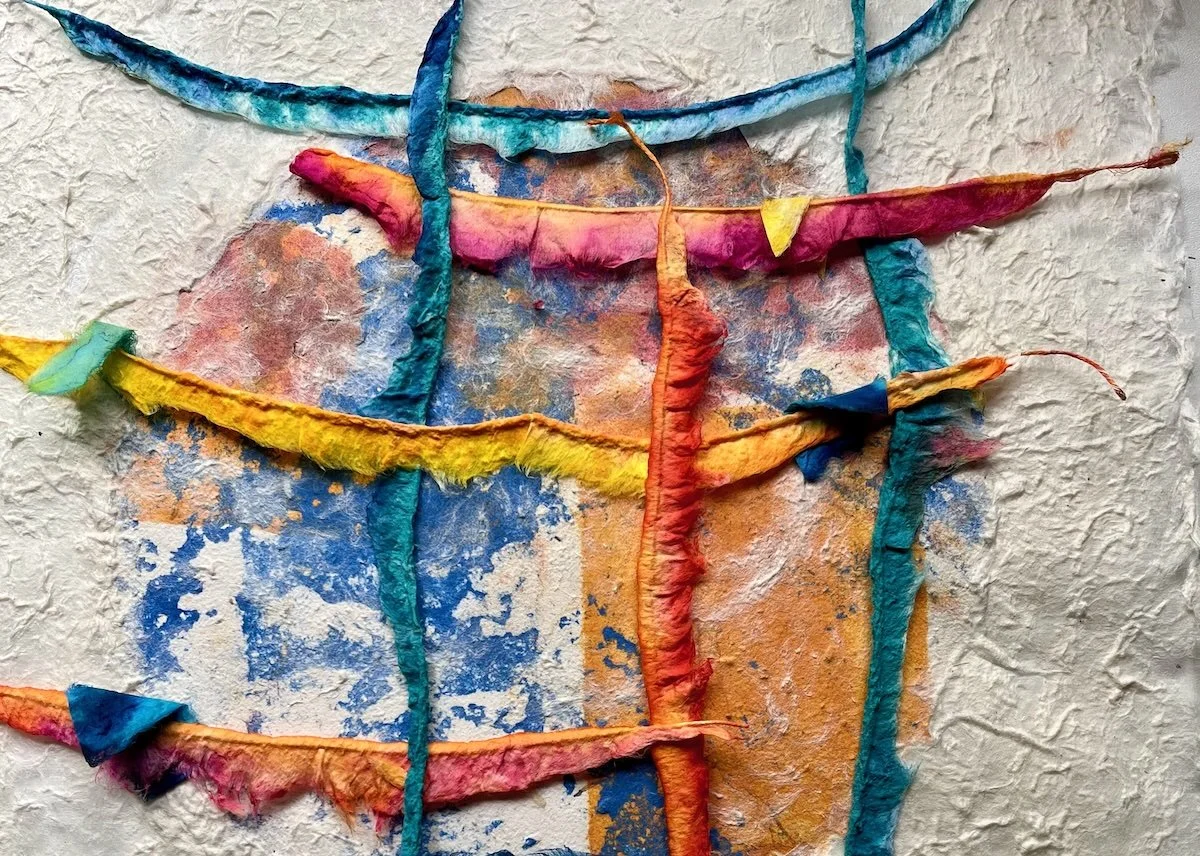 I thought of paper flags that are strung across the streets of Mexican villages, the way the doors and walls of their houses are all painted in bright colours. It gives me joy when I think of them. How to bring that into my paper artwork?