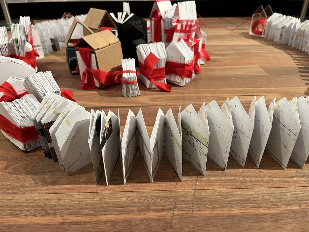 One of the books which caught my attention was by Cobargo artist Rhonda Ayliffe whose home town was ravaged by the 2019 New Years Eve bushfires. She was active in her community working towards establishing the Cobargo Bushfire Resilience Centre and used the stacks of funding submission papers and reports in her artist books, folding them into houses which referenced all the houses that were burnt in the fire.