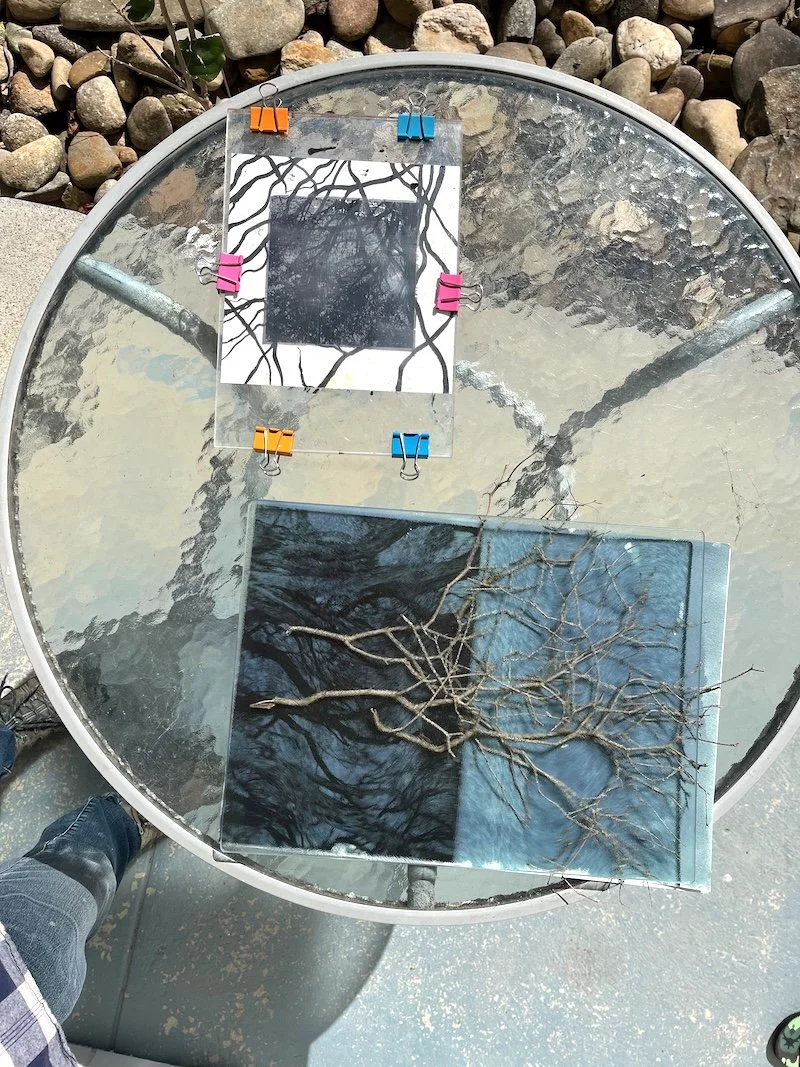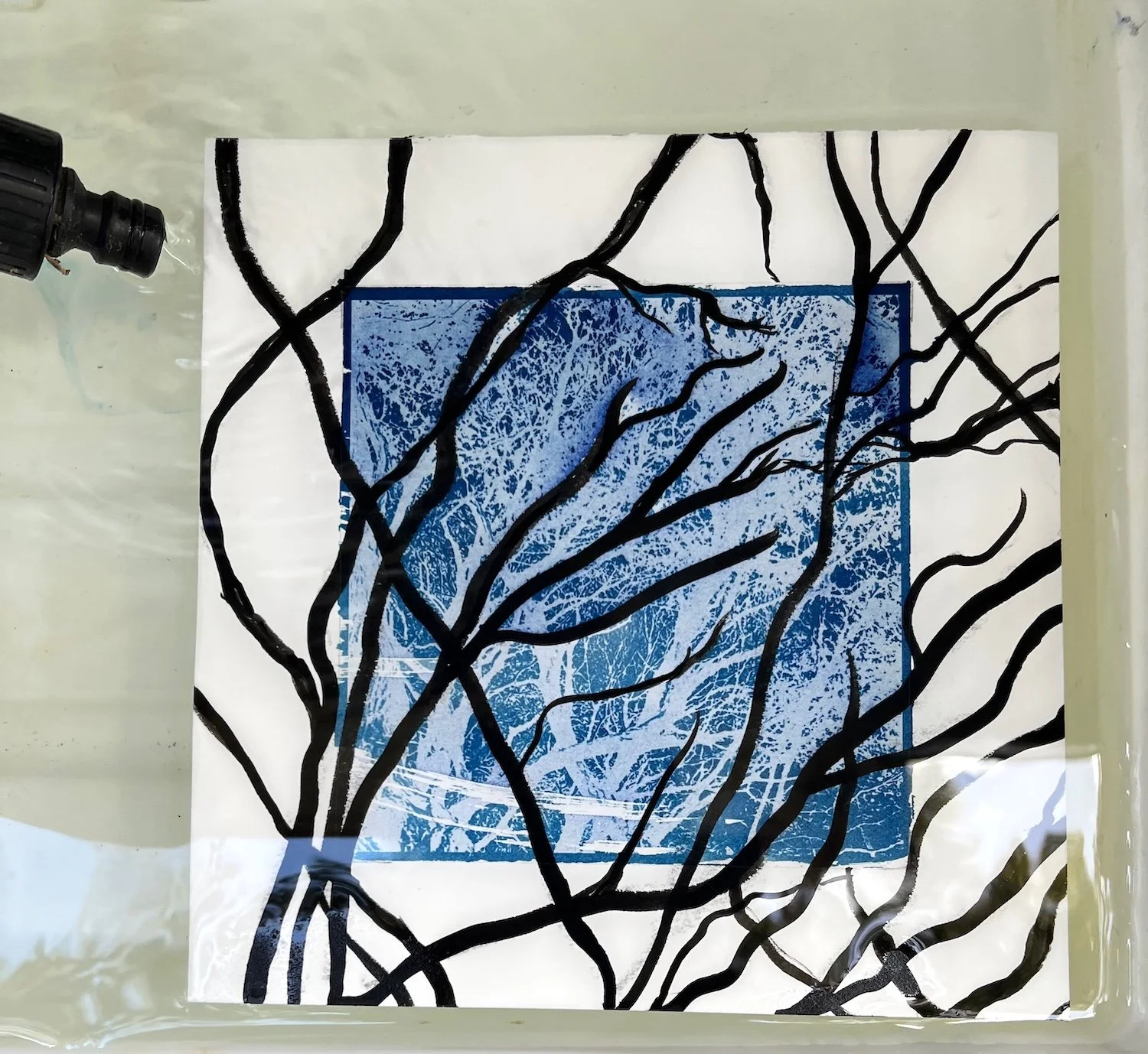 I had planned on creating small squares of cyanotype ‘blueprints’ or sun-prints as they are also called. I had a lovely pad of 100% cotton rag square papers and I took my square format images to Officeworks to get them made into transparencies for the sun exposures.