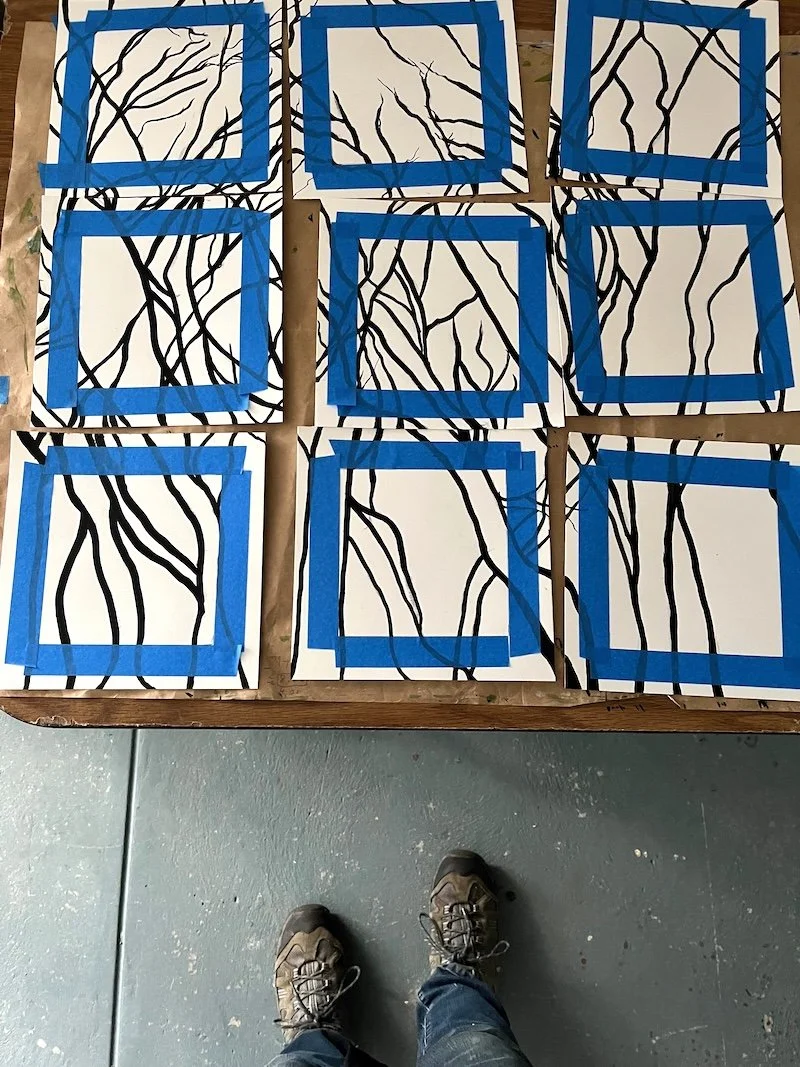 Masked up grid - the cyanotype solution will go inside the blue tape
