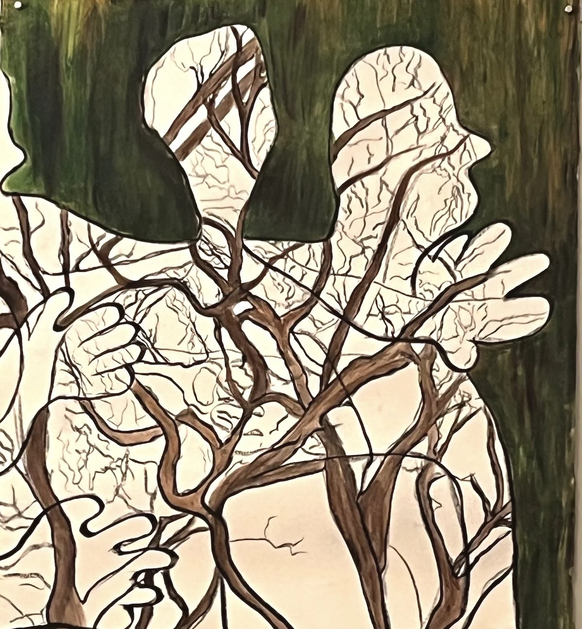 While the chainsaw and tree mulcher were roaring outside, I started painting the bodies of my tree sentinels. Tangled branches entwined in an emphatic embrace as its brother was felled.